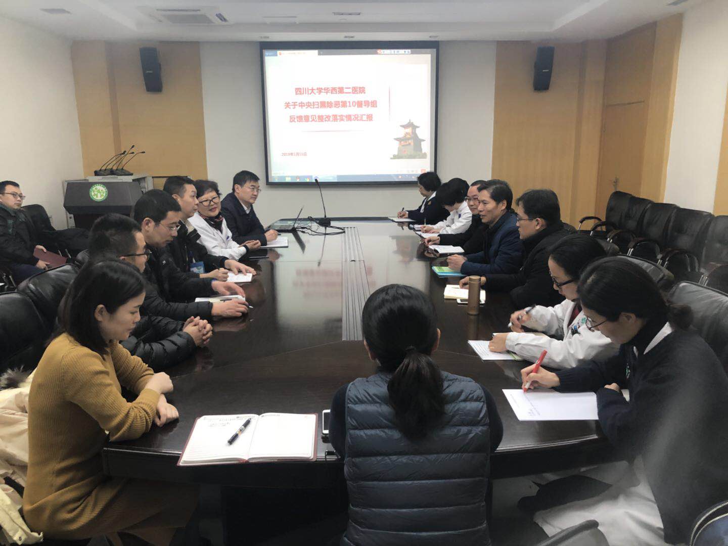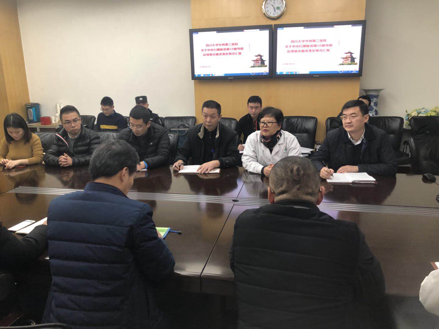 2019年1月15日上午,四川省卫生健康委员会巡查员彭杰带队到我院针对中央扫黑除恶第10督导组反馈意见整改落实情况进行督导检查。督导组对我院进行了细致全面的检查。医院党委书记王素霞带领院长助理喻永红、院长办公室、党委办公室、护理部、后勤管理部、医务部、法务部、采购部、信息管理部、保卫部等相关人员迎接检查。