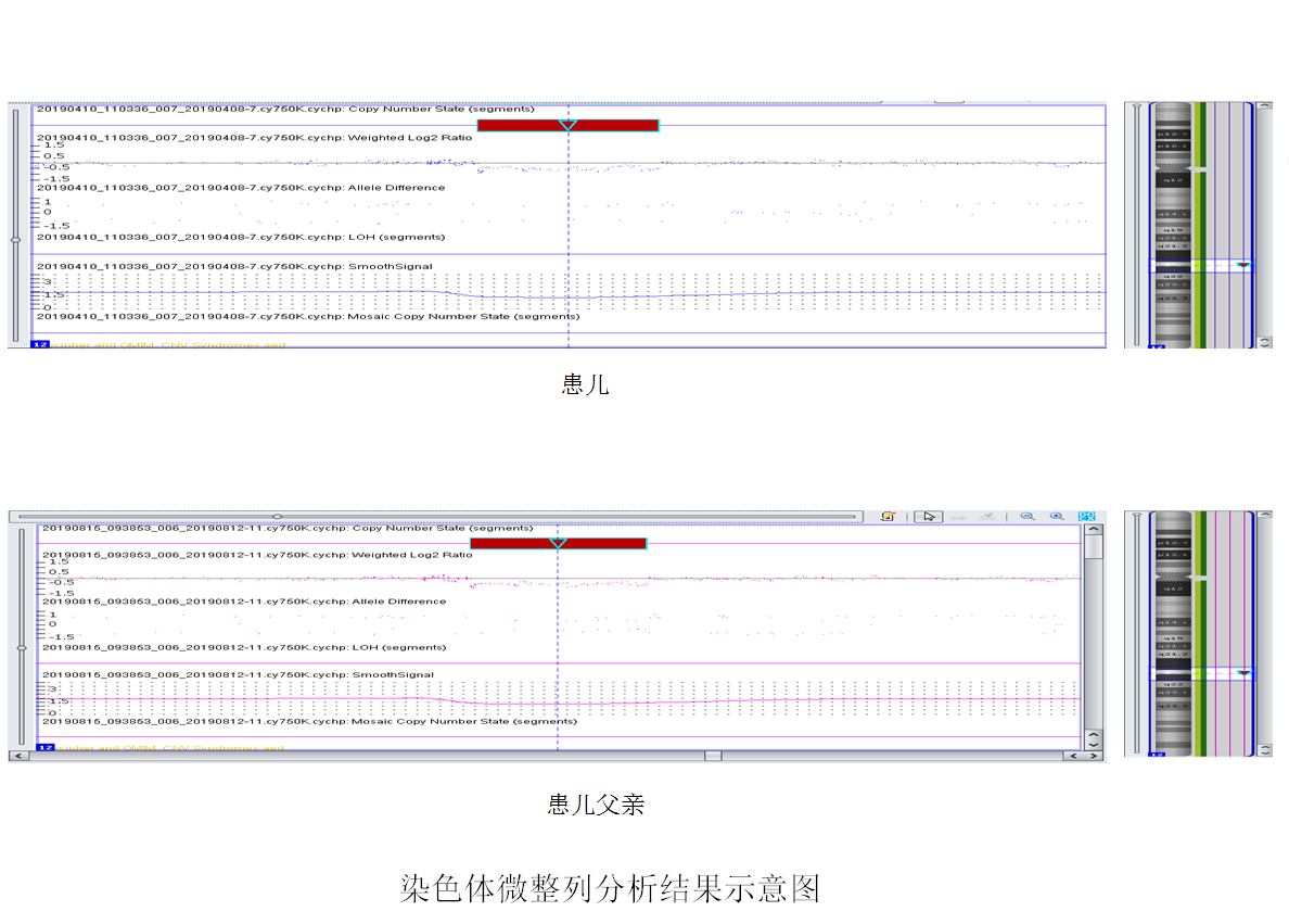 产前诊断中心通过对两位患儿及患儿父母进行家系全外显子测序分析检测发现,两位患儿均携带有来自其母亲的CEP290基因43号外显子c.5953发生的一个无义突变,导致编码的氨基酸链合成提前终止。同时,两位患儿均携带来自其父亲的该基因外显子水平的缺失。为了进一步确定患儿父亲来源的缺失片段的情况,产前诊断中心采用染色体微整列分析技术对患儿及其父亲进行检测,明确了患儿的CEP290基因外显子水平的缺失为外显子1-6号缺失。这两个分别来自父母的不同变异构成了该基因的复合杂合变异。