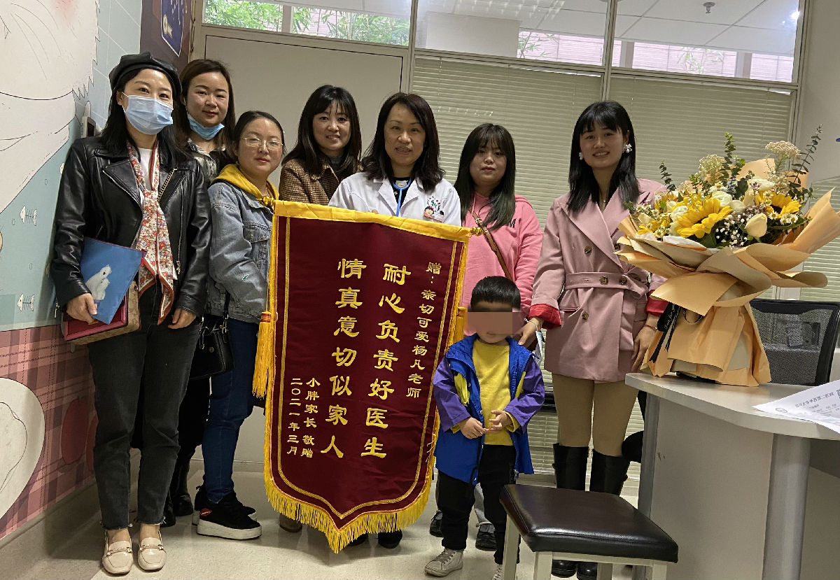 3月15日上午,锦江院区儿科门诊杨凡教授的诊室迎来一行妈妈,她们代表了一个特殊群体:Prader-Willi(小胖-威利)综合征患儿。这些妈妈的孩子们都在之前被诊断为Prader-Willi综合征,定期在杨凡教授的门诊随访治疗,并取得良好的治疗效果。作为一种罕见的遗传病,Prader-Willi综合征需要长期综合治疗管理,过去该种疾病没有纳入救助和医保范围,治疗费用对于普通家庭来说是一笔不小的支出。在过去的几年里,杨凡教授不仅悉心为各个患儿诊疗,还帮助他们寻求包括红会在内的多种基金的救助,减轻其家庭经济负担,尽可能保证每位患儿都得到及时有效的治疗,在未来和普通孩子一样茁壮成长。现在,这些孩子病情得到有效遏制,健康状况明显改善。值得欣慰的是,在杨凡教授等多位教授的积极呼吁和努力下,Prader-Willi综合征的治疗治疗所需药品费用和检查费用于2019年纳入基本医疗保险门诊特殊疾病管理范围。 “小胖”妈妈们喜不自胜,相约这一天来到杨凡教授的门诊,送上一面凝聚着深情的锦旗,感谢杨凡教授多年来的关心、帮助和支持。