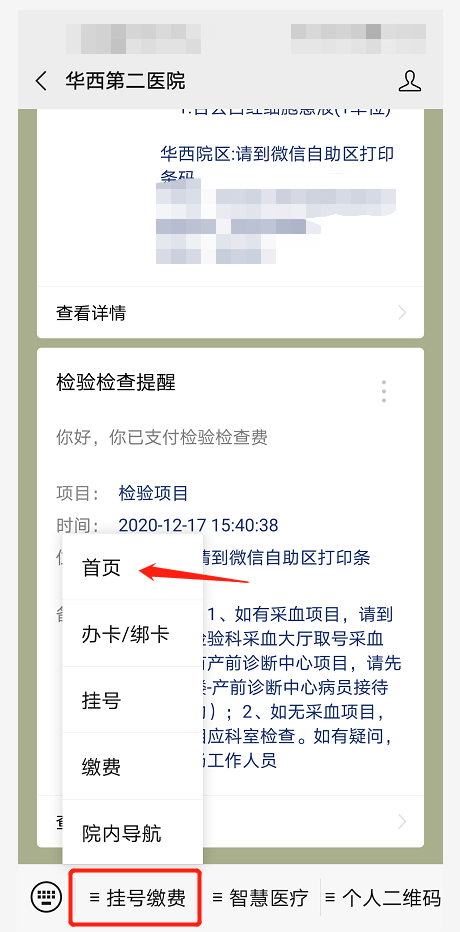 1、打开微信华西二院公众号; | 2、点击挂号缴费—首页 |
