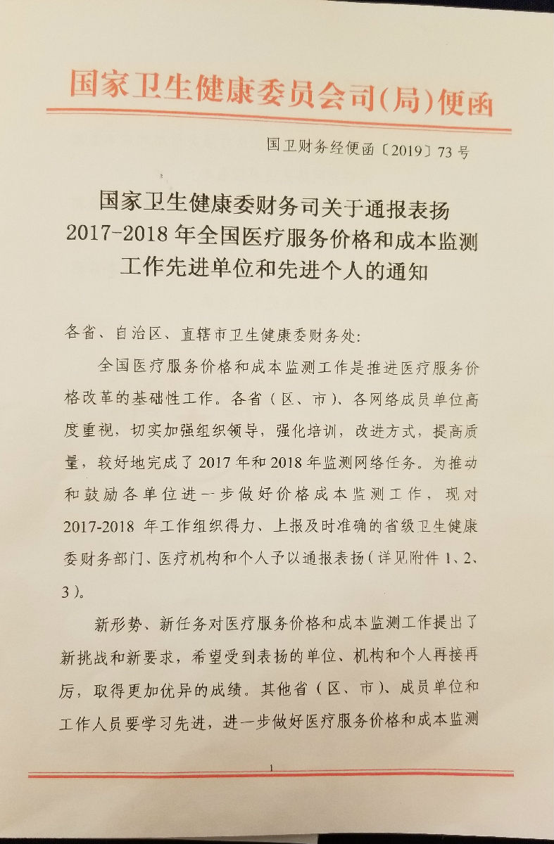 本次受到国家卫生健康委财务司的通报表扬,是对我院医疗服务价格和成本监测工作的肯定,同时也是对今后医疗服务价格和成本监测工作的鞭策。我院将继续努力,在今后的价格和成本监测工作中取得更好的成绩。
