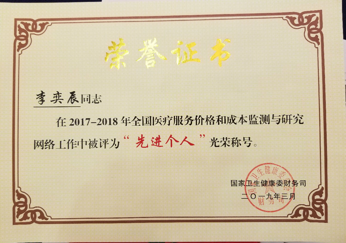 为推动和鼓励各单位进一步做好价格成本监测工作,努力提高数据填报质量,国家卫生健康委财务司于2019年3月 22日在青岛组织召开了《2019年全国医疗服务价格和成本监测与研究网络培训班》,会上对年度工作组织得力、上报及时准确的省级卫生健康委财务部门、医疗机构和个人予以通报表扬。我院从全国参报的1351家监测网络成员单位中脱颖而出,规划财务部李奕辰荣获先进个人称号。据了解,本次全国受表彰的先进个人中,四川省仅有4家医疗机构工作人员获此殊荣。