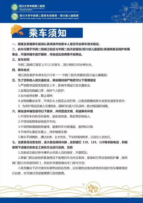 为了方便普通病患及家属前往四川省儿童医院就诊和住院,同时更好的促进四川省儿童医院业务发展,2023年 3月31日后勤管理部正式开通锦江院区前往四川省儿童医院的病患专用交通车。该交通车线路的运行,将极大的改善就诊群众的看病体验,解决看病交通难的问题。