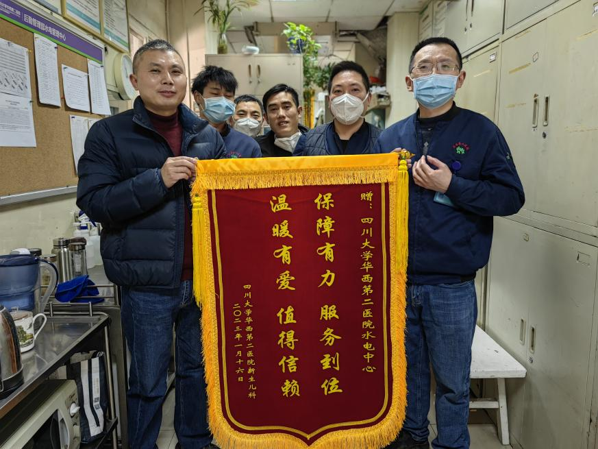 2023年2月14日上午9:00王华主任和陈琼护士长代表医院新生儿科向华西院区后勤管理部设备运行组送上一面“保障有力 服务到位 温暖有爱 值得信赖”锦旗,表达了对我们过去一年服务的谢意,同时也肯定了我们组的工作能力。长期以来后勤管理部设备运行组一直秉持着“服务至上、精细管理、创新服务”的服务理念,特别是在疫情防控这几年,安排专人对医院基础设备进行专业巡检、维修等,全力排解科室的每一个问题,为医院各个科室提供了重要的后勤保障支持。