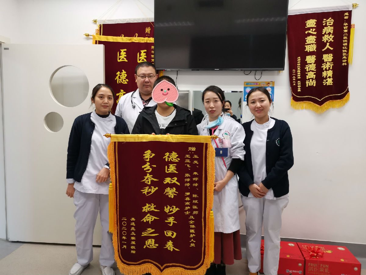 2020年1月13日15时,锦江院区急诊科收到了一面感谢锦旗,上面写着“德医双馨、妙手回春、争分夺秒、救命之恩”,特别感谢急诊科医生王炎、朱婷婷、陈斌,护士王亚飞、张婷婷、罗喜燕及全体医护人员对患儿精心的治疗和无微不至的照顾。
