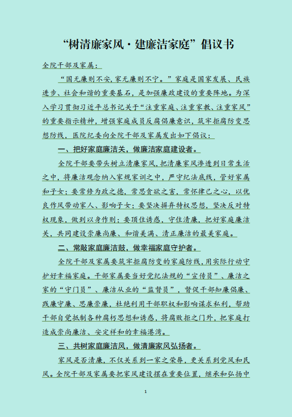 家风不是个人小事、家庭私事,是我们党的优良传统,也是新形势下全面从严治党的题中应有之义。医院纪委希望通过此次倡议,引导全院干部及家属用实际行动构筑起反腐倡廉的家庭防线,培养良好家风,为医院事业健康可持续发展提供坚强保障。