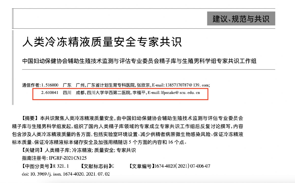 2021年7月25日,我院精子库团队主导的全国第一篇关于《人类冷冻精液质量安全专家共识》发表于《中国计划生育和妇产科》杂志2021年第7期上,并作为该期杂志的重点推荐内容。该共识由中国妇幼保健协会辅助生殖技术监测与评估专业委员会组织,经过3月13日在成都召开专家研讨会,确定共识基本内容;并于5月8日在广州再次召集全国精子库主任召开研讨会,充分征求了全国精子库专家,最终定稿。我院精子库李福平主任为共同通讯作者,我院精子库岳焕勋教授、李福平教授为共识牵头专家,我院鲜泱老师,李福平教授为共识执笔专家。