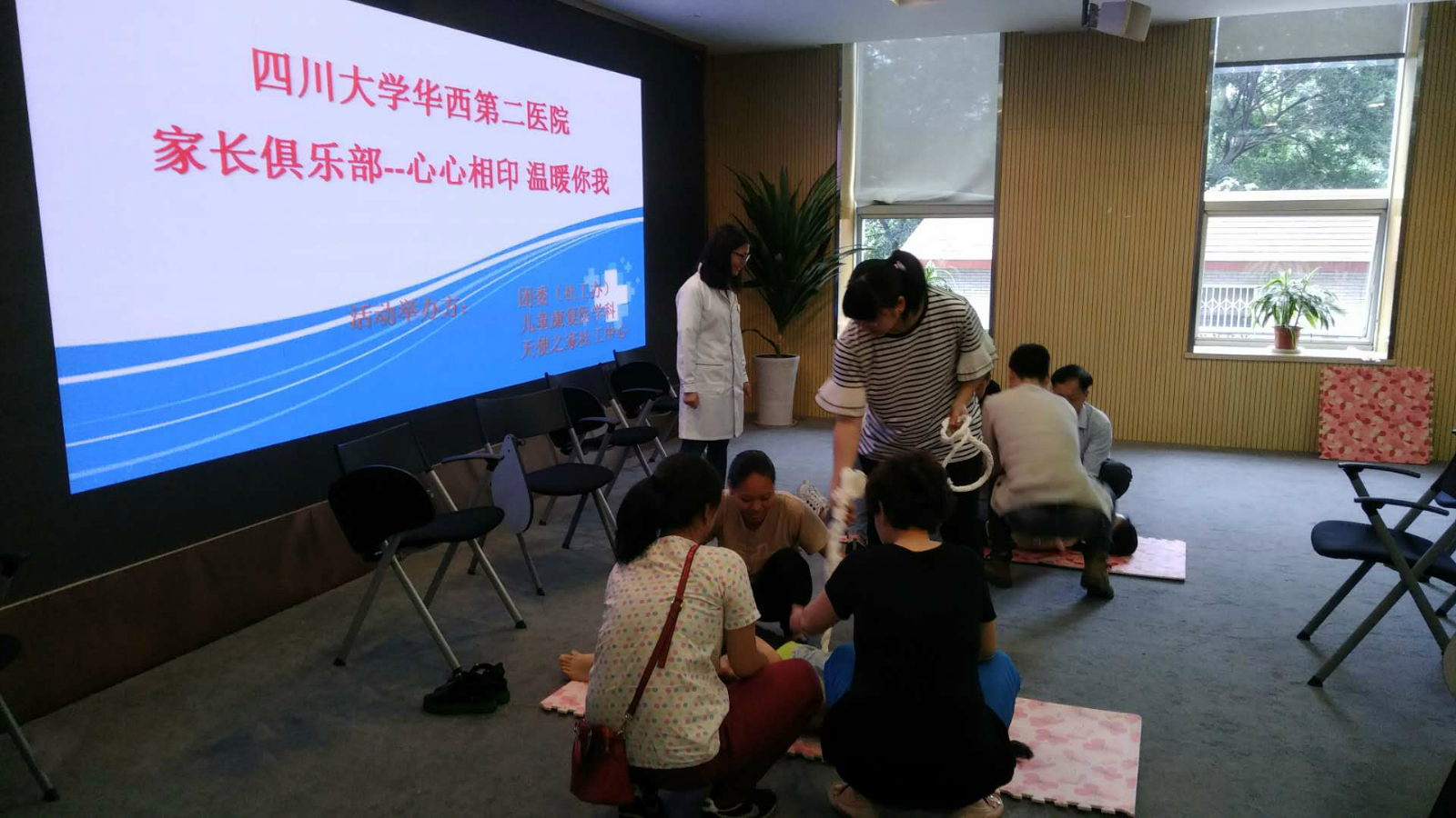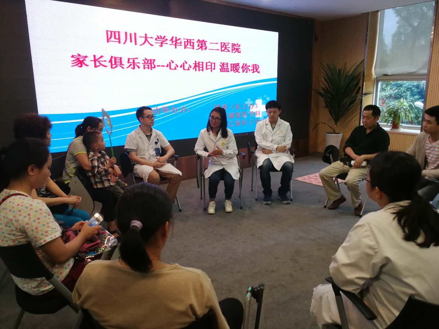 5月17日上午,团委(社工办)联合儿童康复医学科共同开展“心心相印、温暖你我”家长俱乐部系列小组工作。儿童康复医学科周晖主任、康复医师王秋、马丹、团委(社工办)杜琴、天使之家社会工作服务中心的社工以及康复医学科患儿家属参加了此次活动。