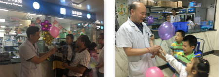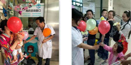 “六一儿童节”是孩子们欢笑的日子,药学部用色彩艳丽的气球与彩带将药房和用药咨询处布置一新,营造了浓厚的节日氛围。药师在为前来取药的患儿与家属发放药品并解答用药问题后,送上了气球和贴纸作为小礼物,真切地送上一句祝福——祝孩子早日康复!