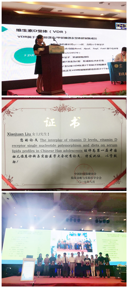 会议期间,中国妇幼保健协会临床诊断与实验医学分会青年委员会正式成立,检验科党支部书记刘小娟同志被聘为青年委员,其撰写的论文 《The interplay of vitamin D levels, vitamin D receptor single nucleotide polymorphism and diets on serum lipids profiles in Chinese Han adolescents 》还被评为优秀论文进行大会交流;另外,党支部组织委员崔亚利同志的论文《1例2-甲基3-羟基丁酰辅酶A脱氢酶缺陷症患儿的临床诊断及治疗》也被接收为大会壁报,进行了宣传交流。(撰稿 伍黎黎 刘小娟 江咏梅 摄影 崔亚利 检验科党团支部供稿)