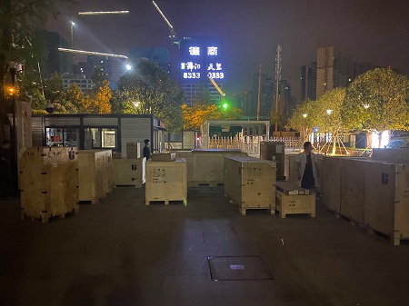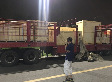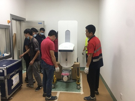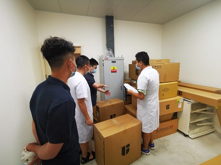 在医学装备部郑雪梅、张沛之、贺磊三位老师组织下,物流公司耗时3个多小时,把设备及配件数量共计19箱,全部安全的卸下。此时已经是9月5日凌晨,医学装备老师此时仍然在现场一丝不苟负责对设备开箱检查。在医学装备部郑雪梅带领下与张沛之、贺磊共同参与对设备进行开箱验货。验货完毕后,医学装备部、工程师与物流公司共同协作在对检查无误的设备运送到科室里。