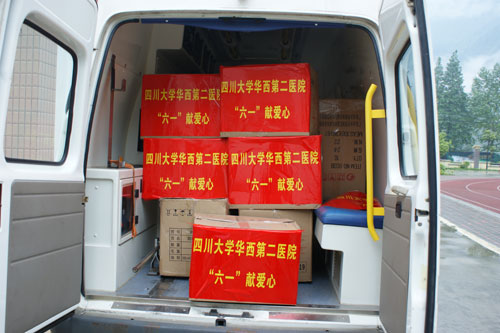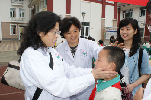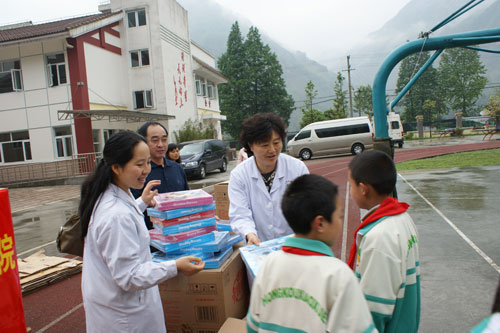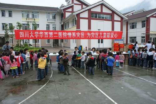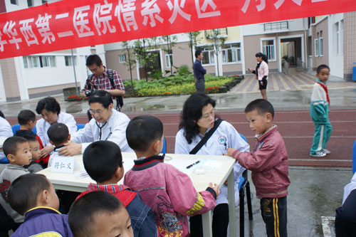 5月31日,四川大学华西第二医院毛萌院长、张文琴副书记率儿科一行15赴都江堰市虹口小学为灾区儿童赠送了价值近6000元的节日礼物,并进行了义诊查体。