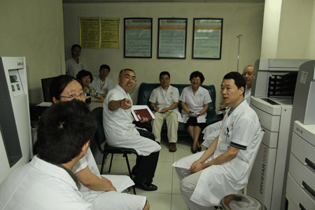 首先,放射科宁刚主任从科室业务工作、科室管理、未来发展计划、面临的问题等四个方面进行了汇报。在业务方面,放射科前五个月介入治疗、CT检查、造影等业务指标与去年同期相比均有较大增涨,最高增幅达35%,平均增幅突破20%。在解决病人看病难的同时,也为医院创造了较好的经济效益。在科室管理方面,实行由主任、副主任、技师长等5人组成的科务小组,定期召开科务会,讨论决策科室重大事项。科室坚持每年召开暑期培训,传达、贯彻落实医院干部培训会议精神。科室指定专人负责医、教、研、人才培养等方面的工作,确保各项工作有人抓。在未来发展方面,宁主任在集中全科人员意见和建议的基础上,通过对放射科目前优势、劣势的分析,提出了科室未来五年的发展目标和实现目标的途径。指出要实现跃居全国同类第三的目标,需争取获得国家级自然科学基金,或者每年至少发表2篇SCI文章。在面临的问题方面,核磁共振的配备成为急待解决的问题,究其根本的原因是空间的问题。因为空间的缺乏,卫生部批准的核磁共振项目迟迟不能落实到位,既影响了学科发展,又不能满足病人的需求。