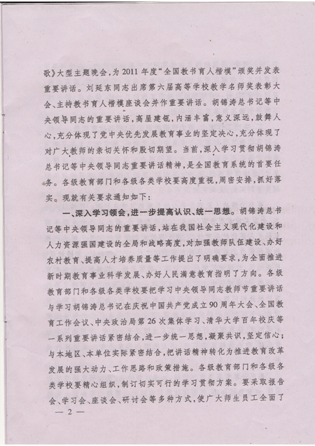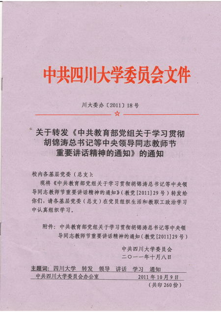 关于转发《中共教育部党组关于学习贯彻胡锦涛总书记等中央领导同志教师节重要讲话精神的通知》的通知