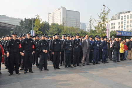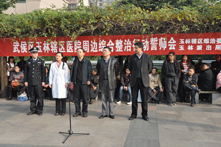 11月23日上午10时30分,为配合“保平安,护民生,冬季严打战役”,武侯区玉林辖区在四川大学华西医院举行了整治医院周边环境,严厉打击“医托、号贩子” 誓师大会,正式启动对华西医院、华西第二医院周边的长期综合整治行动。成都市武侯区综治办高建堂主任,武侯区玉林街道办事处覃丹书记、王希副书记,武侯区玉林派出所李元志所长,华西医院党委副书记黄勇教授和华西第二医院党委副书记王红静教授出席了大会,医院保卫部周宇主任带领10位保安参加了誓师大会。