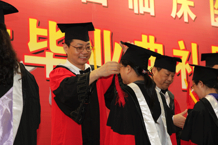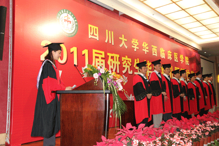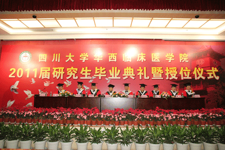 2011年6月20日上午,四川大学华西临床医学院2011届研究生毕业典礼暨授位仪式在华西校区新八教大会议室隆重举行。作为临床医学院学位分委会的委员,我院院长母得志教授全程参与了此次研究生毕业典礼暨授位仪式,并同其他学位委员一到为每一位毕业硕士博士拨穗、正冠、授学位,勉励毕业学子继续努力,不断学习,为华西增光添彩!会上,我院2008级妇产科博士生陈悦代表毕业研究生上台致辞,对老师们的辛勤培养表示感谢!大会最后在李甘地老师领誓的医学生誓词中圆满结束。(供稿、摄影:陈帆)