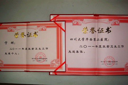 为严格执行国家有关法律法规,加强本院对医用射线装置的管理和放射安全防护工作,保证各射线装置的安全使用,保障病员及工作人员身体健康,我院一直以来严抓放射防护管理工作,2011年经人员调整,成立了由医疗副院长郄明蓉教授担任组长,医务部郭文俊主任及放射科宁刚主任为副组长、集合放射科、小儿心血管科、检验科及后勤服务部几个科室相关工作负责人共同担任组员的放射防护领导小组,全面负责医院射线装置放射性防护工作,制定放射诊疗事故紧急预案,协调各个科室与放射防护的相关工作。在2012年4月27日由四川省卫生监督执法总队组织召开的四川省放射卫生工作总结会议中,我院由于在2011年度表现突出,被授予 “2011年度放射卫生工作先进集体”,宁刚同志也因个人表现突出,获得“2011年度放射工作卫生先进个人”。