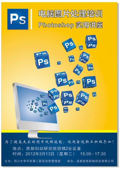 随着信息时代的到来和网络技术的发展,图形图像的设计和处理变得越来越重要,Photoshop已在我们的工作和生活中有着广泛的应用。因此,快速掌握Photoshop知识和使用技术,并应用于现实生活和实际工作中,已成为我们必须掌握的技能之一。为适应这种需求,信息管理部组织了关于Photoshop的培训活动,希望借此为全院职工提供一个学习的机会和平台,欢迎大家积极参加。
