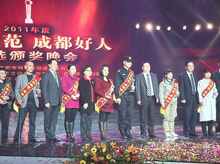2012年2月15日晚,由由市文明委主办,市委宣传统战部、市文明办、市总工会、团市委、市妇联、成都传媒集团、成都公和社区发展基金会承办的2011年度“道德模范-成都好人”颁奖晚会在成都电视台演播大厅举行。市委常委、秘书长、宣传统战部部长何华章致辞,市人大常委会副主任童若春、副市长王忠林、市政协副主席杨兴平出席。省文明办专职副主任张亚平出席颁奖晚会。我院儿科血液/肿瘤科周晨燕医生荣获2011年度“道德模范-成都好人(敬业奉献类)”称号。2012年2月19日晚21:00,成都一台和三台将转播颁奖晚会。