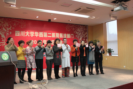 2012年1月13日下午,华西二院医技部门六个科室(放射科、超声科、药剂科、检验科、麻醉科、病理科)在西部妇幼医学研究院二楼会议室召开2011年度年终总结会。医院院长母得志教授、党委书记王素霞研究员带领医院党政班子全体成员莅临大会,医院行政职能部门领导、妇产科教研室、儿科教研室及兄弟部门的领导和同仁们也光临现场;此外,除了坚守窗口工作的同志们外,医技部门六个科室的医务人员非常积极地参与,而且热情的为来宾们服务。