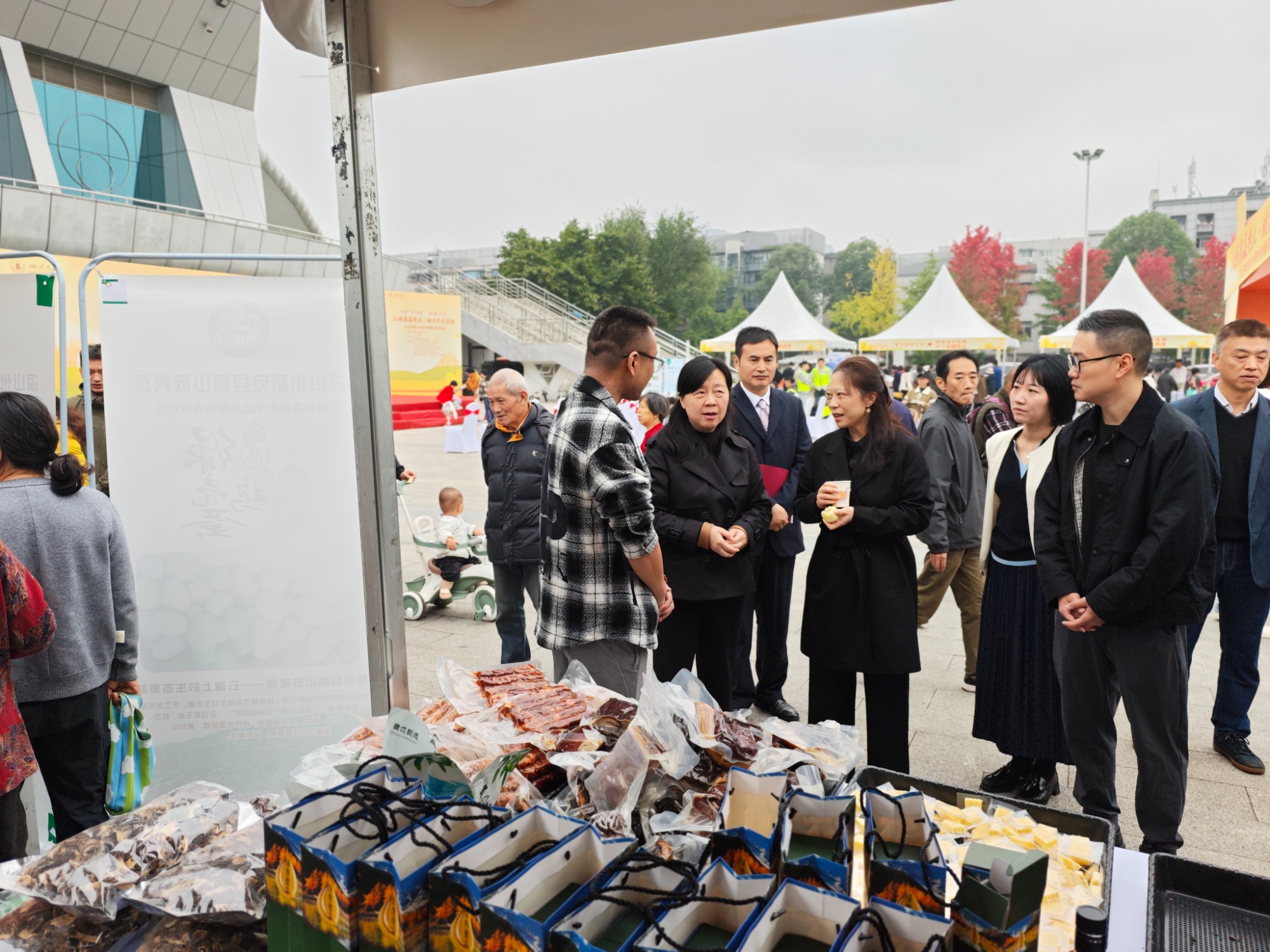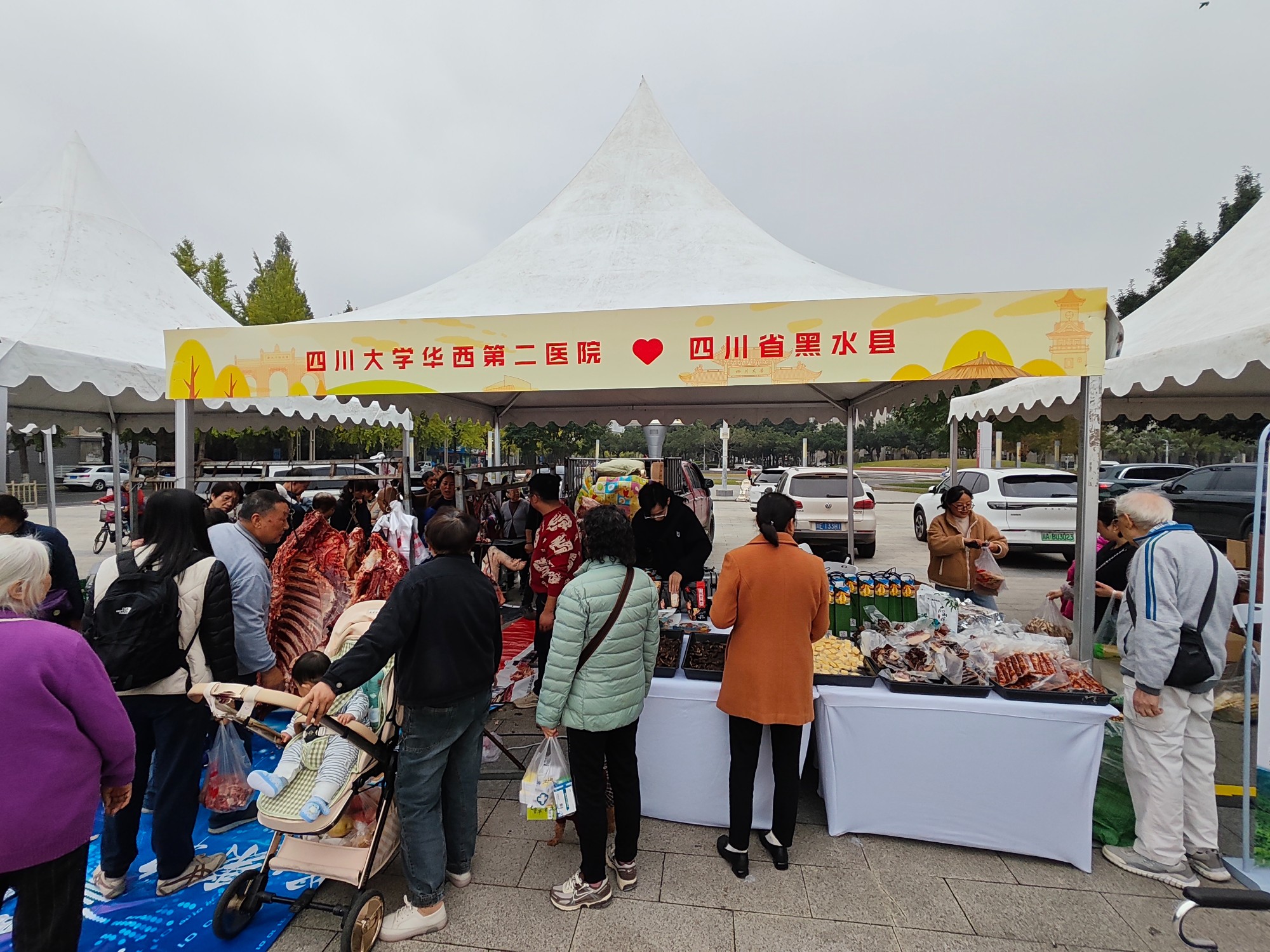 华西第二医院--黑水县展台汇聚了黑水县新鲜牦牛肉、新鲜藏香猪肉、藏香猪腊肉、腊香肠、风干/手撕牛肉、精品核桃油、木耳、高山蜂蜜、高山土豆、牦牛奶制品等农特产品,吸引了不少顾客前来购买。“土豆儿两块钱一斤了!这个土豆真的巴适,吃起又香又面。” “来看哈我们这个核桃油嘛,用的高山早实核桃压榨的,特别适合老年人、儿童和脑力劳动者!”展台前人头攒动,购销两旺。我院驻村工作队两位同志从展销货品组织到会场布展销售,付出了辛勤劳动。