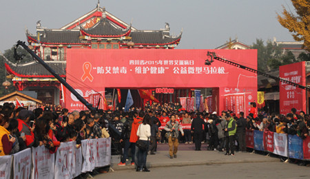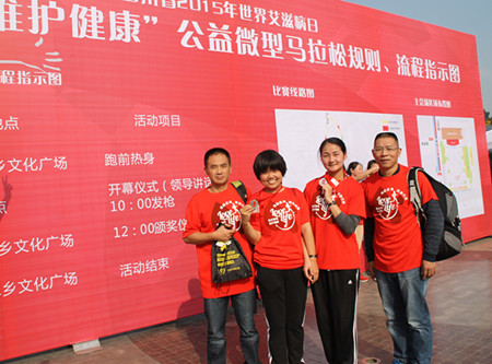 我院职工参加“防艾禁毒.维护健康”公益微型马拉松比赛 2015-11-30 工会 胡宗梅 胡宗梅 分享: 2015年12月1日是第28个“世界艾滋病日”,主题是“行动起来,向'零'艾滋迈进”.省卫计委联合省公安厅于11月29日(星期日)在郫县三道堰文化广场举办” 防艾禁毒.维护健康”公益微型马拉松比赛,我院职工谢杨、罗国强、荆文娟、尹亚楠等参加了本次本赛。沈骥厅长亲自带队起跑,并邀请奥运会冠军张山为运动员鸣抢开赛,一千多名运动员进过艰苦的努力跑完了全场,充分展现了卫生计生人“坚韧、速度、超越、平凡而伟大”的品质。(供稿:胡宗梅摄影:胡宗梅)
